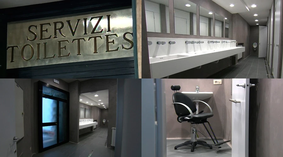 Se trata de tres duchas y un pequeño espacio para el barbero añadidos durante los trabajos de renovación de los baños presentes en el brazo derecho de la Columnata de Bernini en la Plaza de San Pedro.