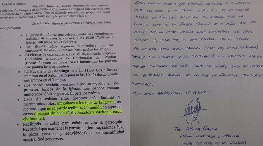 Ante esta situación, la madre divorciada respondió con una carta que colgó en Facebook y que declaraba: “Dado que mi persona y/o situación familiar es ‘irregular’ ante los ojos de la Iglesia y por eso se me prohíbe recibir la comunión en un día tan especial para la familia como es la Primera Comunión de mi hijo, doy por hecho que mi dinero también será considerado de igual manera y como tal no será aceptado por la Iglesia”.