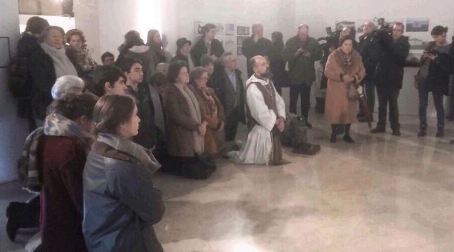 Algunos ciudadanos entraron en el interior de la sala para rezar el rosario en acto de desagravio ante las fotografías de Azcona desnudo junto a las formas consagradas que robó con las que escribió la palabra “pederastia”. Fuera de la sala Conde Rodezno en donde se encuentra la muestra de Azcona, había también más de 300 ciudadanos que siguieron el rezo desde las inmediaciones.