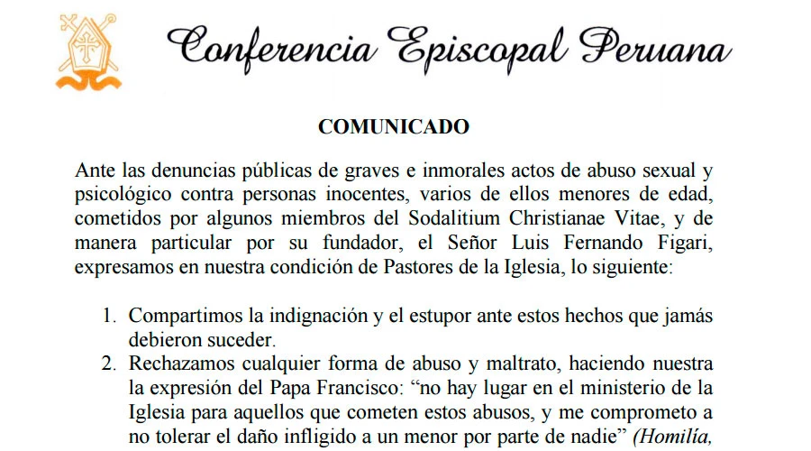 Ante las denuncias públicas de graves e inmorales actos de abuso sexual y psicológico contra personas inocentes, varios de ellos menores de edad, cometidos por algunos miembros del Sodalitium Christianae Vitae, y de manera particular por su fundador, el Señor Luis Fernando Figari, expresamos en nuestra condición de Pastores de la Iglesia, lo siguiente: