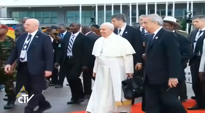 Francisco recorrió los 45 kilómetros de la Nunciatura Apostólica al Aeropuerto de Entebbe en automóvil. A su llegada fue acogido por el Presidente del país, Yoweri Museveni, y por otras autoridades y obispos.