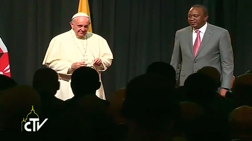 — ACI Prensa (@aciprensa) noviembre 25, 2015Francisco dirigió su primer discurso en África en el encuentro con las autoridades de Kenia y el cuerpo diplomático después de la visita de cortesía al Presidente de la República (Uhuru Kenyatta) en la State House (Casa del Estado).