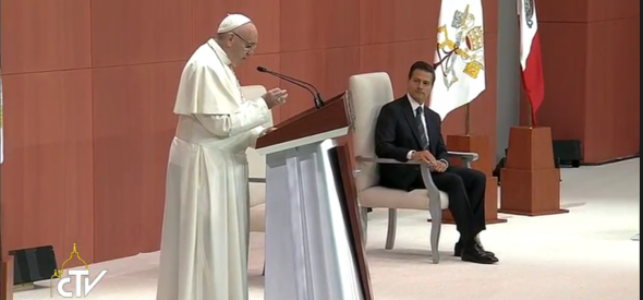 Le agradezco, señor Presidente, las palabras de bienvenida que me ha dirigido. Es motivo de alegría poder pisar estas tierras mexicanas que ocupan un lugar especial en el corazón de las Américas. Hoy vengo como misionero de misericordia y paz pero también como hijo que quiere rendir homenaje a su madre, la Virgen de Guadalupe, y dejarse mirar por ella.