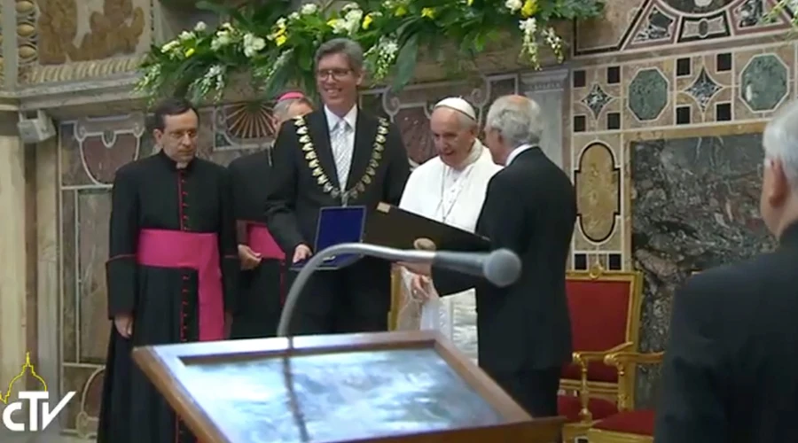 A continuación, se le entregó la medalla, que representa un antiguo sello con el emperador Carlomagno en su trono y tiene grabada la inscripción: “Premio Carlomagno de Aquisgrán 2016 Papa Francisco, Europa – una sociedad de valores”.