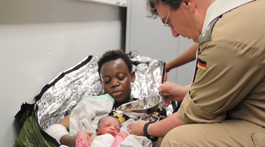 Tras el rescate y después del parto, la madre del niño le pidió encarecidamente al capellán de la embarcación, P. Jochen Folz, que bautizara a su hijo.