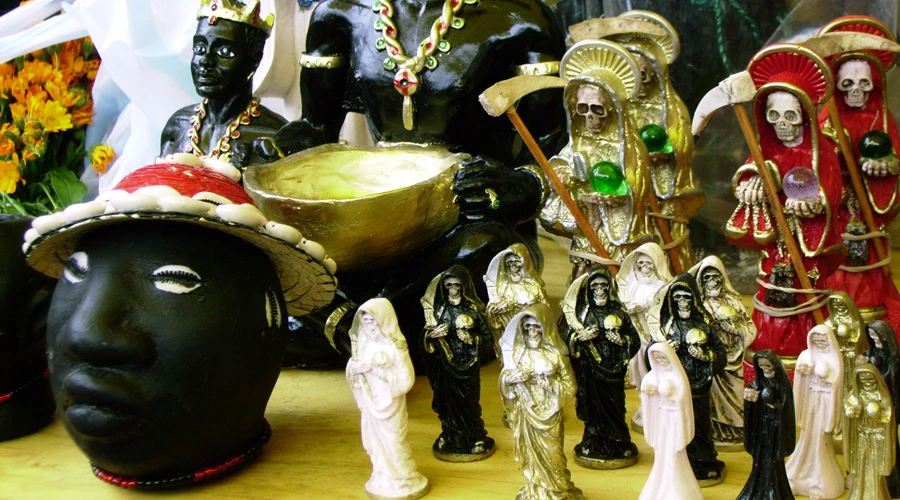 La "Santa Muerte" es una falsa devoción difundida en distintos lugares de México y otros países de América Latina. Es representada con una calavera adornada, según el gusto personal de los adeptos.