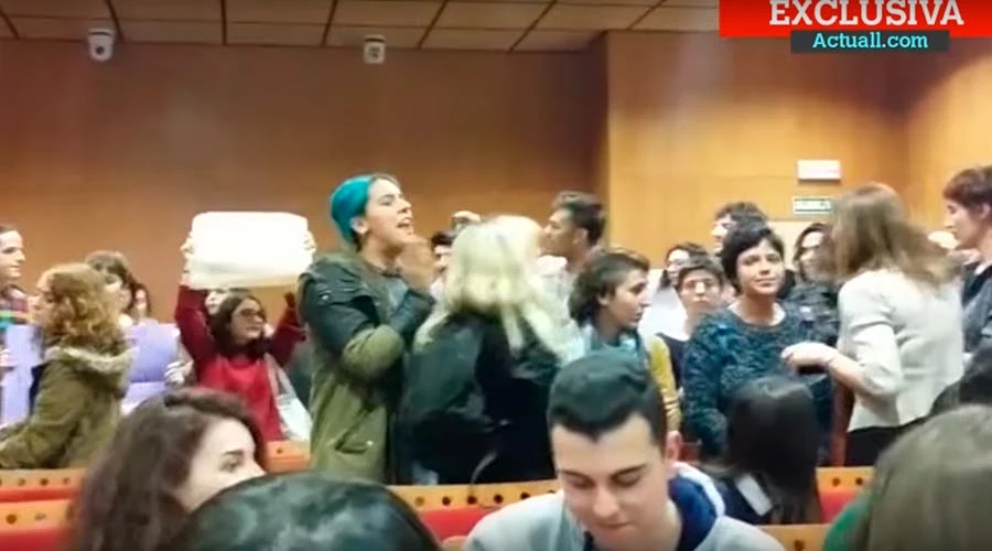 Tal y como muestra el vídeo que muestra en exclusiva Actuall, decenas de personas han irrumpido en la sala donde se iba a celebrar la mesa redonda titulada “Género: ¿Liberación o imposición?” al grito de “hay que quemar la Conferencia Episcopal”.