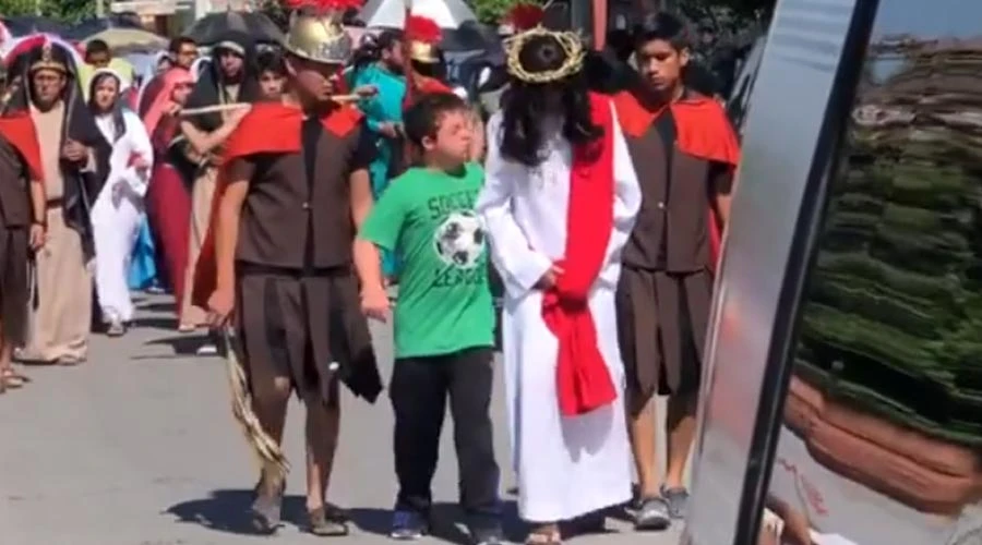 Las imágenes muestran a Juan Pablo acompañando al actor que interpreta a Cristo, quien lleva una corona de espinas y camina escoltado por tres soldados romanos, mientras que el resto de los fieles los siguen.