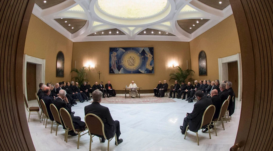 Según informó la Oficina de Prensa de la Santa Sede, la reunión con los 34 obispos se realizó en la antesala del Aula Pablo VI a las 4:00 p.m. (hora local).