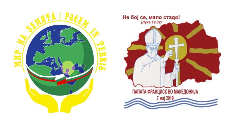 El logo de la visita a Macedonia muestra al Papa Francisco bendiciendo al país, cuyo mapa está cubierto por la bandera nacional.