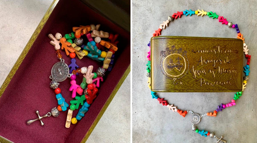En sus manos portaban una caja de madera grabada con el logo del ministerio “Amigos de Jesús y María”. En su interior había un bello rosario de colores cuyas cuentas tienen forma de niños que representan los cinco continentes.