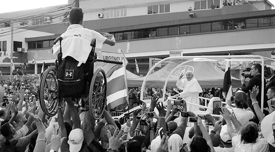 La foto pertenece a Carlos Yap, que la compartió en su cuenta de Instagram. En esta se aprecia a Lucas, un joven de 17 años que participa en la parroquia Inmaculada Concepción de La Chorrera, Panamá, y que es alzado en su silla de ruedas por sus amigos para que pueda ver pasar al Santo Padre. Como se ve en la imagen, Francisco vio el gesto y dio su bendición al peregrino.