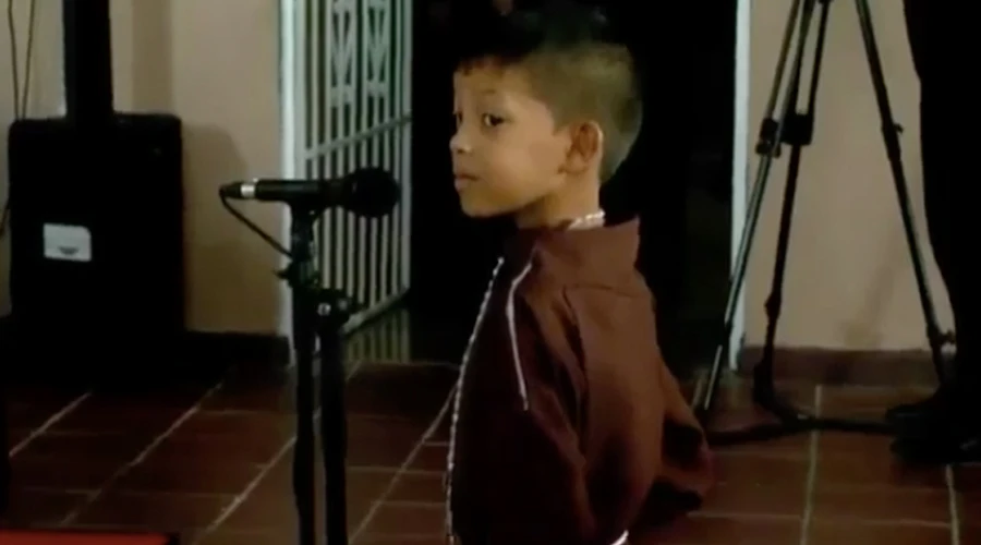 El pequeño, vestido de franciscano y con un rosario blanco colgado en el cuello, esperó unos segundos hasta que comenzará la pista musical, pero al fallar esta, comenzó a cantar un extracto de “Hazme un instrumento de tu paz”, oración atribuida a San Francisco de Asís: