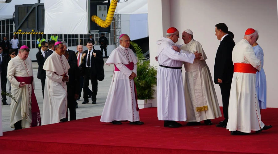 En la bienvenida que ofrecieron al Santo Padre, todos los obispos presentes, entre los que estaban el Arzobispo de Panamá, Mons. José Domingo Ulloa; y el Nuncio Apostólico, Mons. Mirosław Adamczyk, estaban vestidos de blanco.
