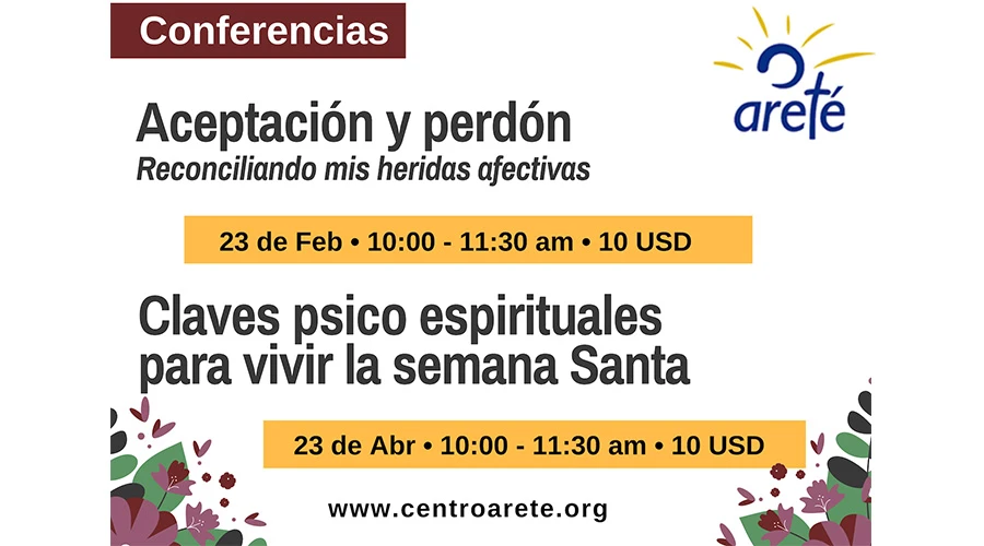 Las dos primeras conferencias son: “Aceptación y Perdón, reconciliando mis heridas afectivas”, que se realizará el sábado 23 de febrero; y “Claves psico espirituales para vivir la Semana Santa”, que se dará el sábado 13 de abril