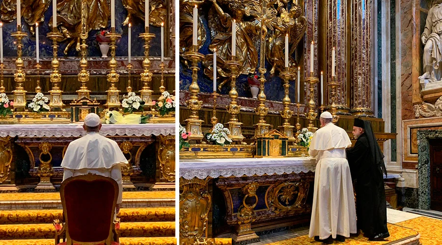 En las fotografías se observa al Santo Padre meditando durante unos instantes ante la imagen mariana de la Salus Populi Romani (Protectora del Pueblo Romano).