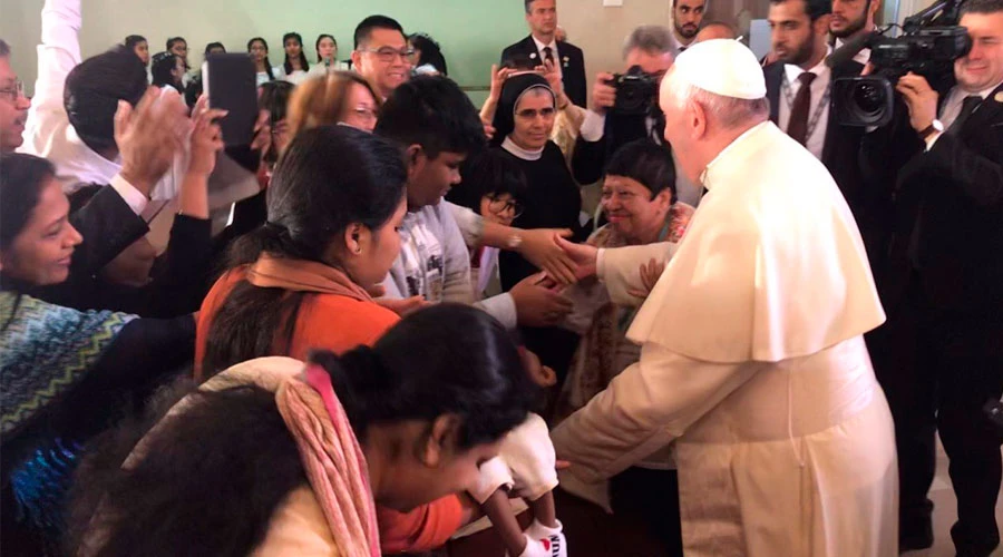Francisco realizó un breve saludo a los presentes, afirmó que para él es una gran alegría poder visitar las jóvenes Iglesias como la presente en los Emiratos y agradeció a los fieles por su testimonio.