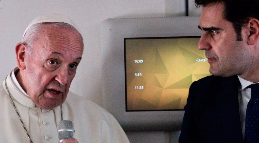 Santo Padre una pregunta relacionada en realidad a la que acaba de hacer mi colega porque no tuvimos tiempo de coordinarla. Como le dije el viaje pasado tuve la posibilidad de entrevistar al nuevo Arzobispo de Mosul en Irak, que siempre dice que lo están esperando y niega que estén a propósito discutiendo los obispos, sino que simplemente lo están esperando. Usted habló de la libertad religiosa que va más allá de la libertad de culto. ¿Puede hablar un poco más de este tema? Estamos volviendo de un país que es conocido por su tolerancia, sin embargo muchos de los católicos que estaban hoy en el predio deportivo, recién hoy por primera vez desde que llegaron a Emiratos Árabes Unidos pudieron ser abiertos con su fe, con sus creencias. Entonces ¿se puede ver un cambio que vaya más allá de simplemente hoy?