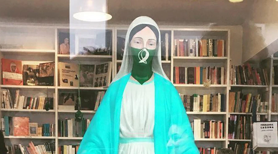 La imagen blasfema se trata de la advocación Medalla Milagrosa amordazada con el pañuelo verde. Según la cuenta de Facebook del centro cultural, esta “obra” se exhibirá en la librería para la “muestra feminista colectiva Para todes, tode [Plan de lucha], curada por Kekena Corvalan”.
