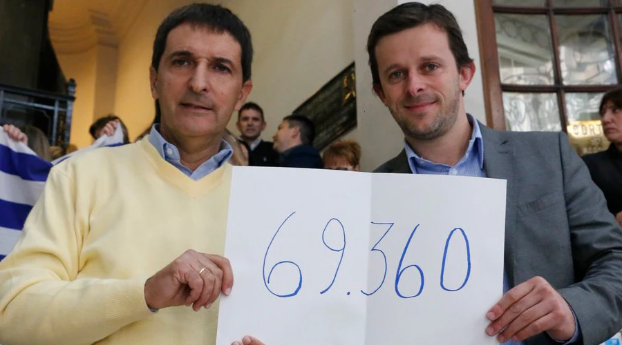 Iafigliola, del “Movimiento Adelante Pro Vida y Familia”, y Dastugue, de “Esperanza Nacional”, presentaron el 25 de marzo ante la Corte Electoral de Uruguay 69.360 firmas para iniciar el primer paso de derogación de la Ley Integral para Personas Trans.