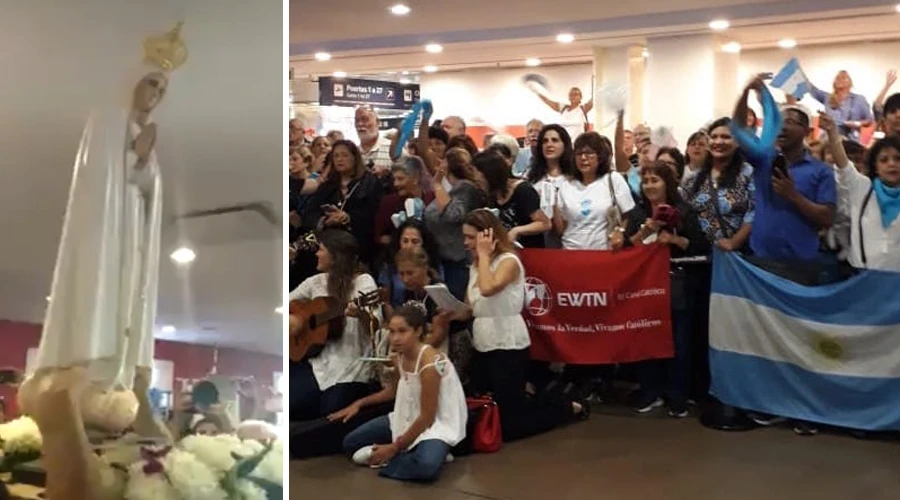 <blockquote class="twitter-tweet" data-lang="es"><p lang="es" dir="ltr">Cuánto cariño! Fieles y devotos reciben a la imagen peregrina de la Virgen de Fátima que ya está en Argentina. Gentileza: <a href="https://twitter.com/MisionFatimaARG?ref_src=twsrc%5Etfw">@MisionFatimaARG</a> - <a href="https://twitter.com/aciprensa?ref_src=twsrc%5Etfw">@aciprensa</a> <a href="https://t.co/JNqzfM6520">pic.twitter.com/JNqzfM6520</a></p>— Giselle Vargas ن (@Giselle_VN) <a href="https://twitter.com/Giselle_VN/status/1113180759798542337?ref_src=twsrc%5Etfw">2 de abril de 2019</a></blockquote> <script async src="https://platform.twitter.com/widgets.js" charset="utf-8"></script>Pasadas las 7:00 a.m. una comitiva ingresó con la imagen en un anda por la puerta del Terminal A, donde fue recibida por los fieles entre vítores, cantos y banderines, con quienes se realizó una breve procesión.