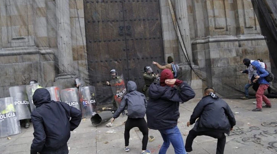 Así fueron los enfrentamientos entre la @PoliciaColombia y algunos manifestantes esta tarde en la Plaza de Bolívar en Bogotá. Con piedras y pintura La Catedral Primada se vio vandalizada. pic.twitter.com/RSJgXG1wcK