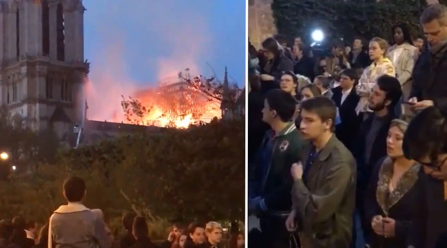 En un video publicado en Twitter se puede ver a un grupo de franceses con el rosario en las manos, algunos de rodillas, cantándole a la Madre de Dios, a quien está dedicada la catedral parisina.