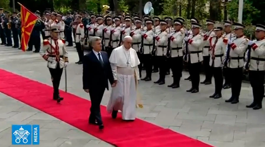 Tras recibir honores de Estado en el jardín de acceso al Palacio, donde una banda militar interpretó los himnos de Macedonia y de la Ciudad del Vaticano, el Papa y el Presidente Gjorge Ivanov, accedieron al interior del Palacio donde ha tenido el encuentro privado entre ambos mandatarios.
