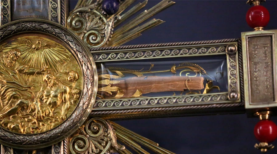Además de los fragmentos de la Santa Cruz, en la cripta de la Basílica se conserva la reliquia de la tabla con el mensaje, en hebreo, griego y latín, de “Jesús Nazareno Rey de los Judíos”, ordenada colocar por Pilato en lo alto de la Cruz de Cristo.