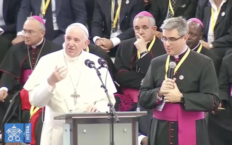 El Santo Padre llegó al Pavillon Maxaquen junto al Arzobispo de Maputo, un estadio con capacidad máxima de 15.000 personas, y pronunció un discurso en portugués improvisando y añadiendo frases en español e italiano.