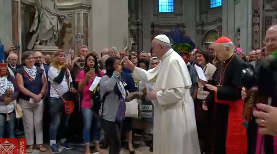 A continuación se realizó una procesión hasta el Aula del Sínodo, en la que los indígenas portaron una canoa con una imagen descrita hace unos días por Vatican News en portugués como “Nuestra Señora de la Amazonía”, todo colocado sobre una red de colores que según una participante del evento representaba el Evangelio y “la diversidad”.