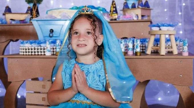 La pequeña no olvidó y para la fiesta de los 5 años volvió a pedir que el tema fuera "Madre del Cielo". Y así la familia cumplió el sueño de Manu, con imágenes de la Virgen Aparecida, rosarios como recuerdos e incluso un vestido azul, del color del manto de Nuestra Señora.