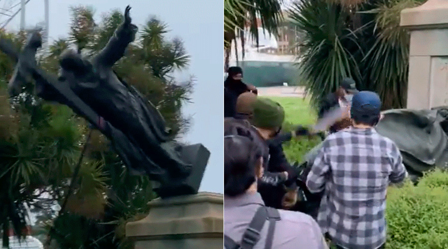 Un video publicado en Twitter muestra cómo un grupo de manifestantes usan una correa para derribar la estatua que data del año 1907 y que fue diseñada por el conocido escultor estadounidense Douglas Tilden.