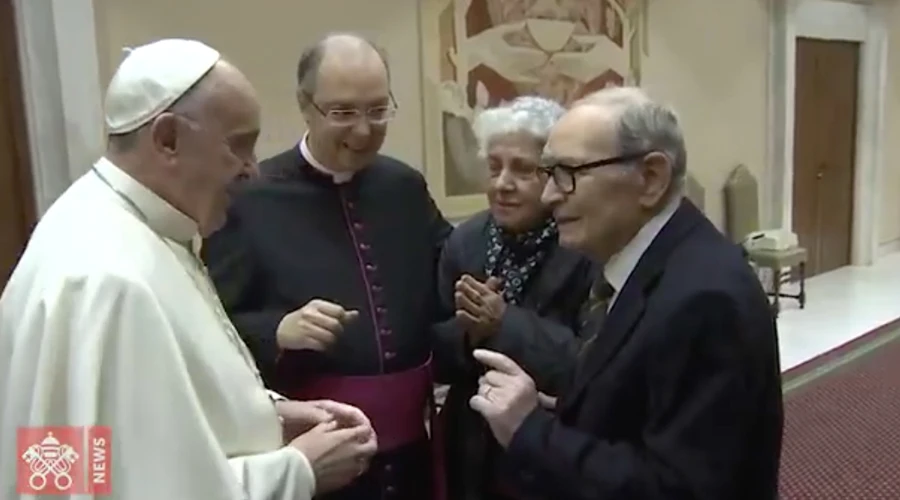 El Papa Francisco conoció a Ennio y María Morricone en 2015, cuando el famoso compositor de música para películas y ganador del Premio Óscar interpretó una Misa que compuso en honor al Pontífice.