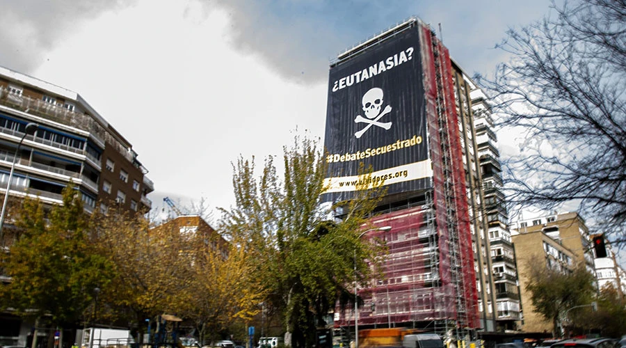 La lona de 500 metros cuadrados se desplegó en un edificio del Paseo de la Habana, en Madrid (España), en ella se podía leer "¿Eutanasia?" y el hashtag #DebateSecuestrado", con el que esta iniciativa fue trending topic en twitter en España durante el 30 de noviembre durante al menos 3 horas.