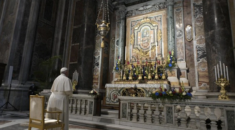 El Santo Padre, frente al ícono de la Virgen del Socorro, dio unas palabras iniciales: “Al inicio del mes dedicado a la Virgen, nos unimos en oración con todos los Santuarios esparcidos en el mundo entero, con los fieles y con todas las personas de buena voluntad, para confiar en las manos de nuestra Santa Madre toda la humanidad, duramente probada por este periodo de pandemia”.