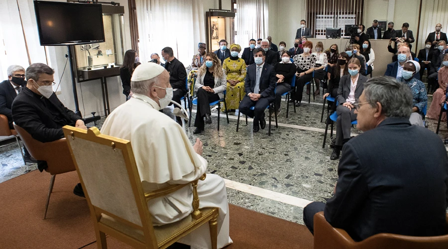 A su llegada, el Papa fue recibido en la puerta por el prefecto del Dicasterio, Paolo Ruffini y por el secretario del Dicasterio, Mons. Lucio Ruiz.