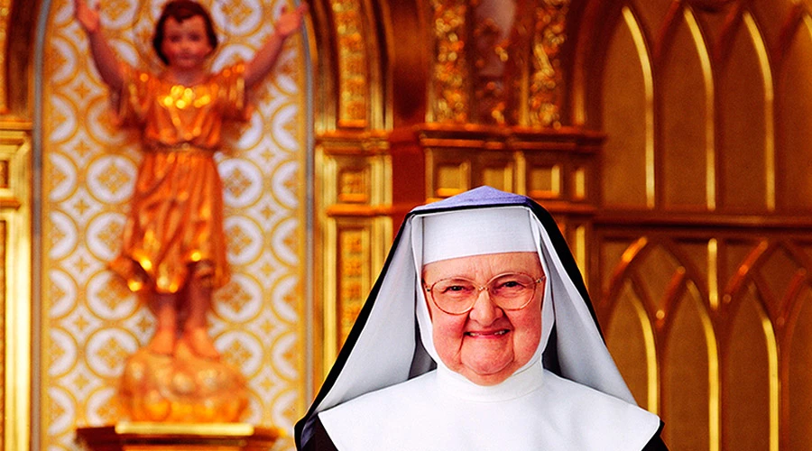 Madre Angélica junto a imagen del Divino Niño, mientras se construía el Santuario del Santísimo Sacramento. Foto: EWTN.