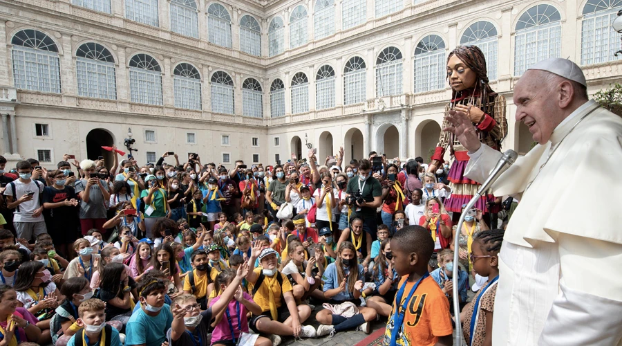 Los niños acompañaron a una marioneta gigante de 3.5 metros de “la pequeña Amal” procedente de Gaziantep, cerca de la frontera entre Turquía y Siria, y que representa a “una joven refugiada en búsqueda de su familia y que relata simbólicamente los sufrimientos de muchos menores migrantes”, explicó la sección Migrantes y Refugiados del Vaticano.