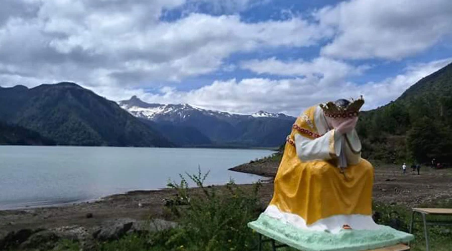 En un día frío y con lluvia, los fieles de la parroquia Sagrada Familia de la localidad de Hornopirén peregrinaron hacia el santuario ubicado en el Lago Cabrera, entre los volcanes inactivos Yates y Hornopirén.