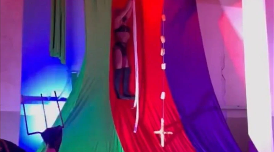 En una de las muestras un sujeto se suspendió en un rosario gigante que colgaba del techo, desde el cual realizó gestos eróticos y se masturbó.