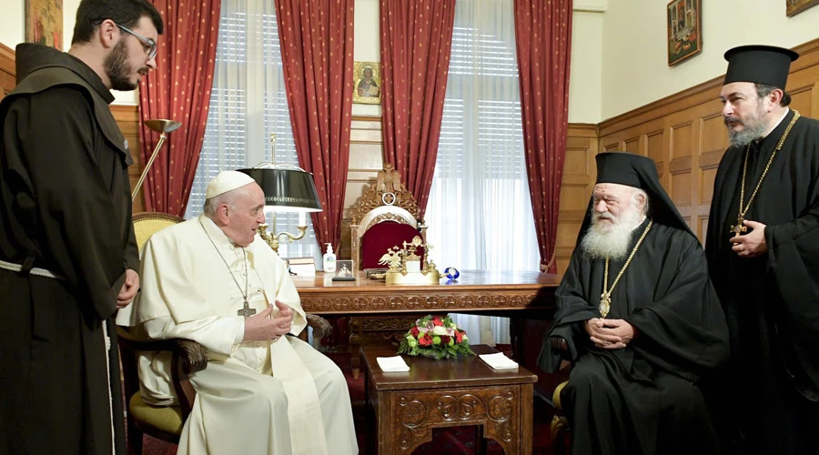 «Gracia y paz de parte de Dios» (Rm 1,7). Lo saludo con estas palabras del gran apóstol Pablo, las mismas con las que, mientras se encontraba en tierra griega, se dirigió a los fieles de Roma. Hoy nuestro encuentro renueva esa gracia y esa paz. Rezando ante los trofeos de la Iglesia de Roma, que son las tumbas de los apóstoles y de los mártires, me he sentido impulsado a venir aquí como peregrino, con gran respeto y humildad, para renovar esa comunión apostólica y alimentar la caridad fraterna. En este sentido deseo agradecerle, Beatitud, por las palabras que me ha dirigido y que correspondo con afecto, saludando, por medio suyo, al clero, a las comunidades monásticas y a todos los fieles ortodoxos de Grecia.