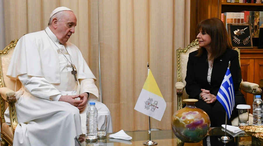 En su encuentro con Sakellaropoulou, el Santo Padre saludó a las delegaciones, para luego dirigirse a una sala del palacio donde conversó en privado con la presidenta del país.